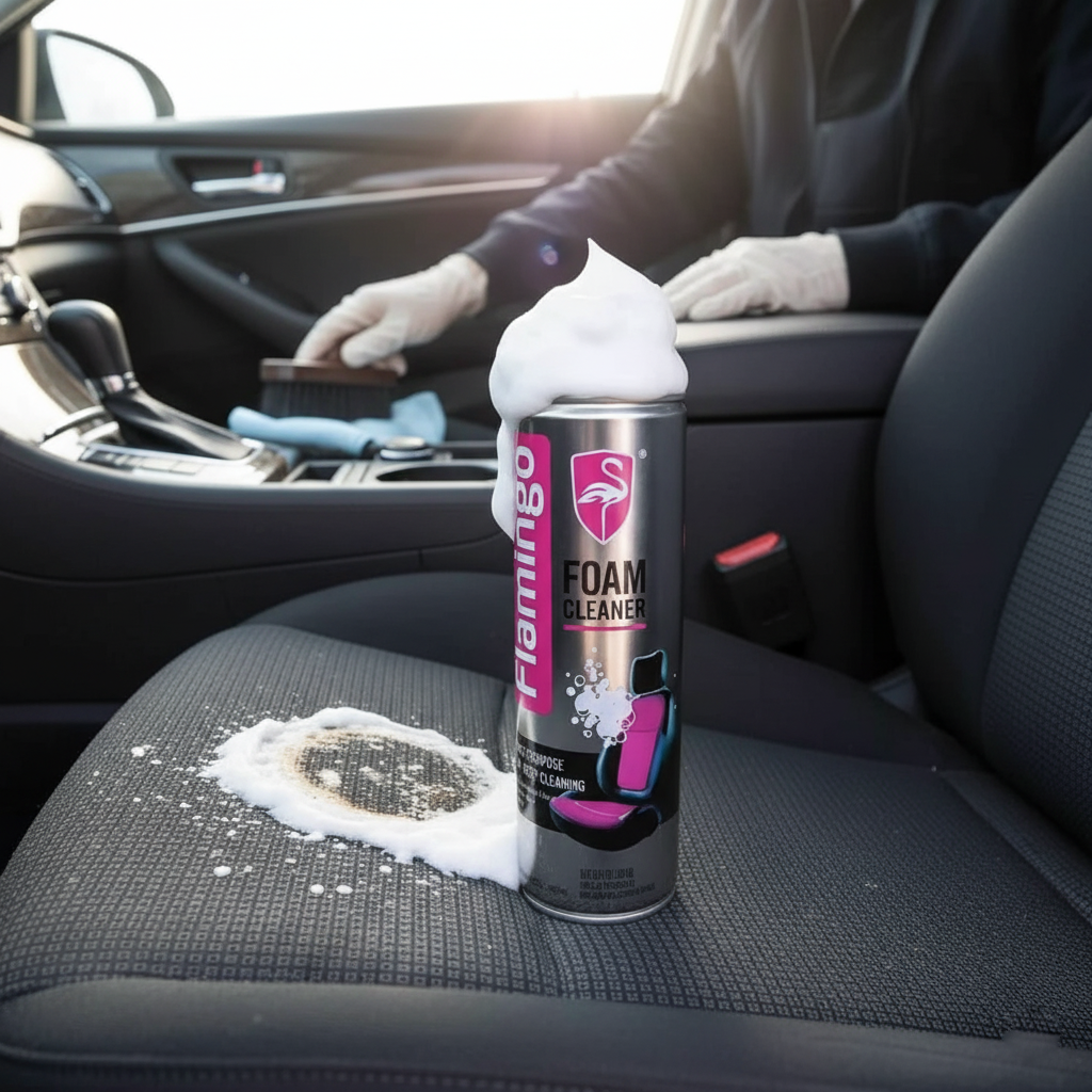 La Espuma Limpiadora Flamingo elimina polvo, grasa, y residuos en segundos, dejando un aroma fresco y una sensación de limpieza total.